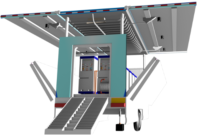 專(zhuān)業(yè)舞臺木地板,折疊舞臺地板采用30mm專(zhuān)業(yè)舞臺木板和鋼骨架組裝而成,表面加鋪2mm小花紋鋁板。兩翼的底板承受的能力需要承重5噸?梢圆捎檬须娀蜍(chē)上安裝的發(fā)電機發(fā)電供給教學(xué)設備使用解決了偏遠地區缺電的問(wèn)題,有外接電纜接口。培訓頂棚設計安裝了給予培訓時(shí)需要裝備的燈光、投影儀、攝像頭,風(fēng)扇等器件。車(chē)內有可放置多種實(shí)訓設備,設有電源插座。電源線(xiàn)采用阻燃絕緣、性能良好的橡套線(xiàn)。通過(guò)液壓系統與電控系統的有效組合、控制,實(shí)現整車(chē)頂棚及地板的有效張開(kāi)及固定,使整車(chē)鋪開(kāi)成培訓平臺。再連接各燈光、培訓、教學(xué)及相關(guān)控制臺,來(lái)達到培訓教學(xué)的目的?筛鶕脩(hù)需求的不同進(jìn)行變化,適應性強。通過(guò)運用組合式、模塊化、多功能的設計原理,采用了軟硬件相結合,硬件為主軟件為輔的設計思路。