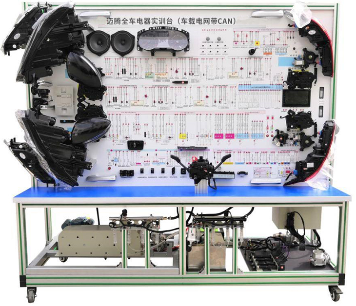該設備采用 全新 邁騰B8L 2021款整車(chē)電器實(shí)物為基礎,充分展示汽車(chē)發(fā)動(dòng)機防盜系統、儀表系統、燈光系統、雨刮系統、喇叭系統、點(diǎn)火系統、電動(dòng)車(chē)窗系統、電動(dòng)門(mén)鎖、音響系統、起動(dòng)系統和充電系統等汽車(chē)電器各系統的組成結構和工作過(guò)程。