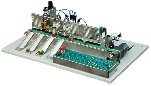 材料分揀模型采用臺式結構,配有PLC 主機、單相交流電動(dòng)機、氣缸、電磁閥、旋轉編碼器等部件,選用了顏色識別傳感器及對不同材質(zhì)敏感的電容式和電感式傳感器,分別固定在網(wǎng)板上。該裝置涵蓋 PLC技術(shù)、氣動(dòng)技術(shù)、傳感器技術(shù)、位置控制技術(shù)等內容,可培養學(xué)生PLC 編程及系統調試,掌握傳感器使用、電氣傳動(dòng)及氣動(dòng)控制等技術(shù)。