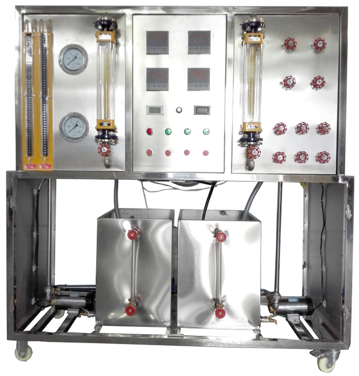 鋼原水箱及加熱水箱,順、逆流調節閥門(mén)組,阻力測試壓力表及U型差壓計,加熱功率由固體調壓模塊無(wú)級調節,萬(wàn)能信號輸入巡檢儀顯示溫度,電流表,電壓表,不銹鋼臺架及控制屏等。