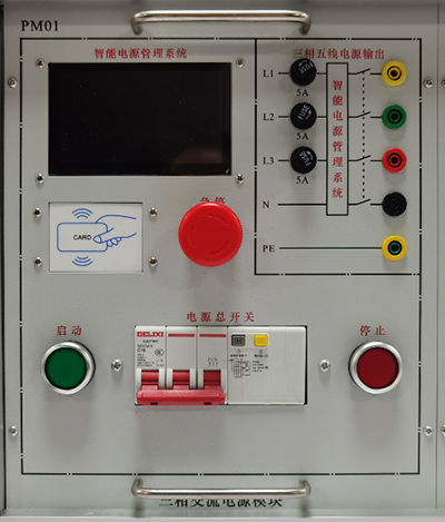(1)提供線(xiàn)電壓380V交流電源、相電壓220V交流電源。交流電源輸出設有電源保護系統,相間、線(xiàn)間過(guò)電流及直接短路均能自動(dòng)保護。提供三相漏電保護器作為整個(gè)實(shí)驗平臺的電源總開(kāi)關(guān)。三相輸出通過(guò)停止和啟動(dòng)按鈕控制。