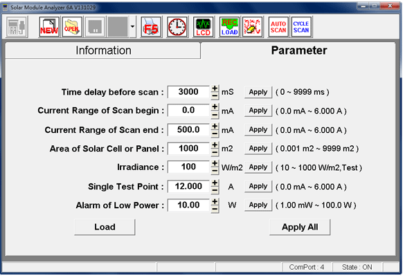 ● 可測量參數: I-V曲線(xiàn),P-V曲線(xiàn),短路電流,開(kāi)路電壓,峰值功率,峰值功率點(diǎn)電壓、電流,定電壓點(diǎn)電流,填充因子,轉換效率,串聯(lián)電阻,并聯(lián)電阻,太陽(yáng)電池溫度,環(huán)境溫度、輻照度。