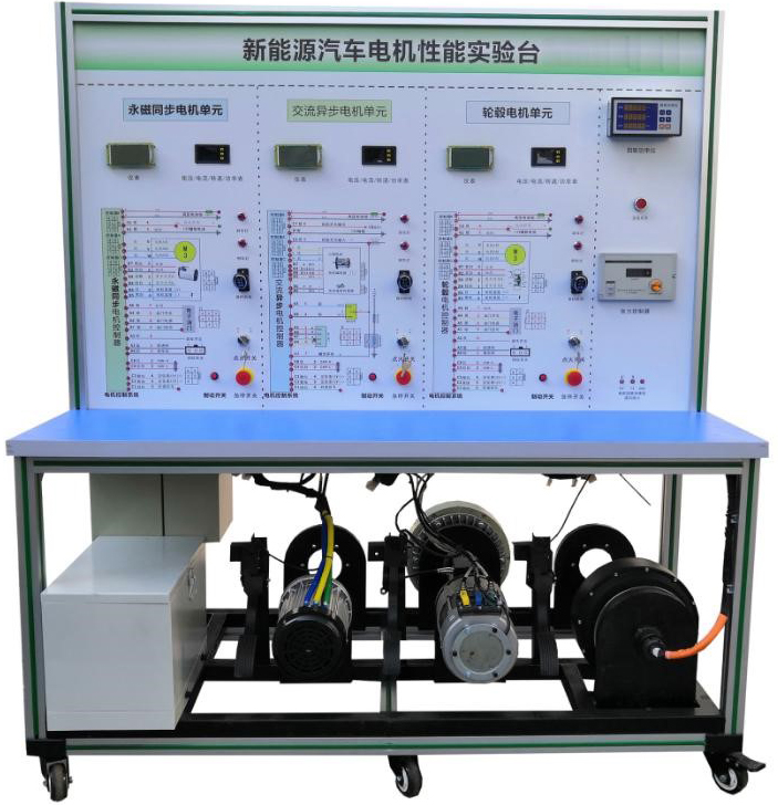 檢測控制面板(裝有各種檢測端子,1448×940mm彩色電路圖和工作原理示意圖)、組合儀表、點(diǎn)火開(kāi)關(guān)、電機控制器、車(chē)載充電器與充電接口、DC-DC轉換器、鋰動(dòng)力電池組、電動(dòng)車(chē)電機(包含三種電動(dòng)車(chē)常用電機:60V2.2KW3000rpm永磁同步電機,60V2.2KW3000rpm交流異步電機,60V2KW3000rpm直流無(wú)刷電機)、剎車(chē)開(kāi)關(guān)、檔位開(kāi)關(guān)、油門(mén)控制裝置、大電流繼電器、電源總開(kāi)關(guān)、急停開(kāi)關(guān)、輔助蓄電池(12V45AH)、電機性能檢測系統(數顯電壓電流表、轉速表、扭矩表、功率表、磁粉制動(dòng)器、測試上位機軟件)、電機及扭矩傳感器與磁粉制動(dòng)器連接器、SX-96B數顯表、一體化全鋁合金型材搭建的移動(dòng)臺架(1500×700×1700mm 帶自鎖腳輪裝置,帶安裝檢測端子的原理面板,面板1448×940mm)、故障考核系統、設備操作說(shuō)明書(shū)。
