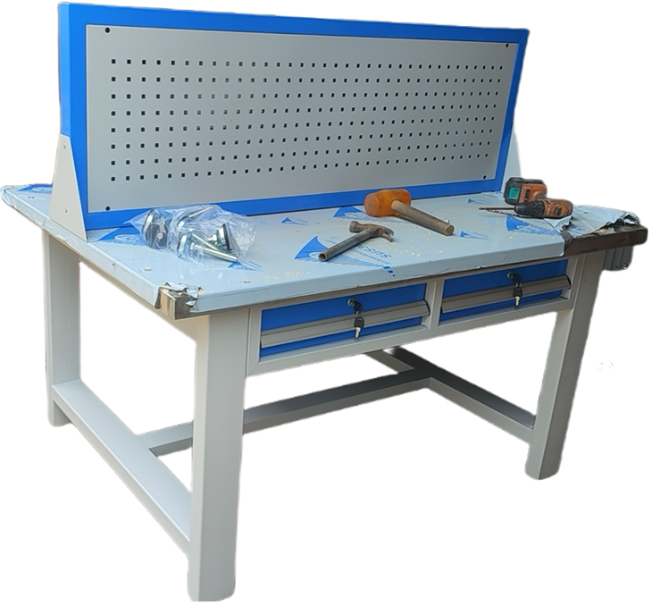 2、鉗工桌采用重型復合桌面,總厚度40mm(表面采用1.2mm亞光鍍鋅鐵板,中間采用38mm實(shí)木復合板芯,底面采用板防火貼面板,經(jīng)過(guò)60噸壓力機膠合定型而成)。具有臺面平整、抗劃傷、防銹、承重性好、防震,噪音低等優(yōu)點(diǎn)。