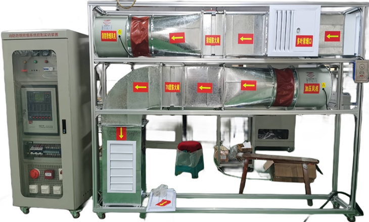 防煙排煙系統實(shí)訓裝置由模擬房間配備系統和排煙風(fēng)機系統組成(主要由風(fēng)口、風(fēng)閥、排煙窗和排煙風(fēng)機、排煙防火閥、送風(fēng)機、送風(fēng)風(fēng)道以及排煙風(fēng)道和相關(guān)的火災探測器、聯(lián)動(dòng)控制系統組成。