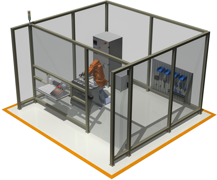 安全護欄:隔離護欄,高1000mm,框架采用2mm厚灰色棟梁鋁合金型材,鋼化玻璃10mm厚;工作站全部通透利于觀(guān)察,玻璃中間沒(méi)有隔斷;并安裝一個(gè)側開(kāi)門(mén);門(mén)上安裝安全檢測元件,機器人自動(dòng)運行必須在門(mén)關(guān)閉狀態(tài)下進(jìn)行;系統工作站安裝有3個(gè)急停按鈕,分別位于操作控制臺、模型安裝臺、隔離護欄上,以備緊急情況使用。