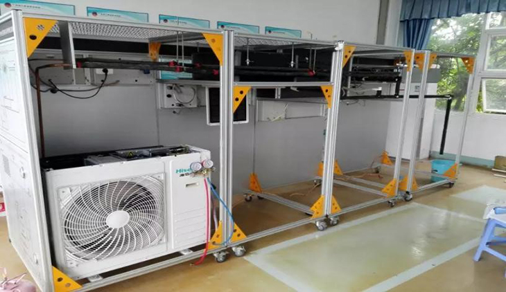 1、安裝實(shí)訓架子:實(shí)訓裝置采用移動(dòng)框架4040鋁型材結構,底部使用3加有四個(gè)固定支撐腳,安裝好后可固定位置,防止移動(dòng)而牽動(dòng)制冷系統管路。