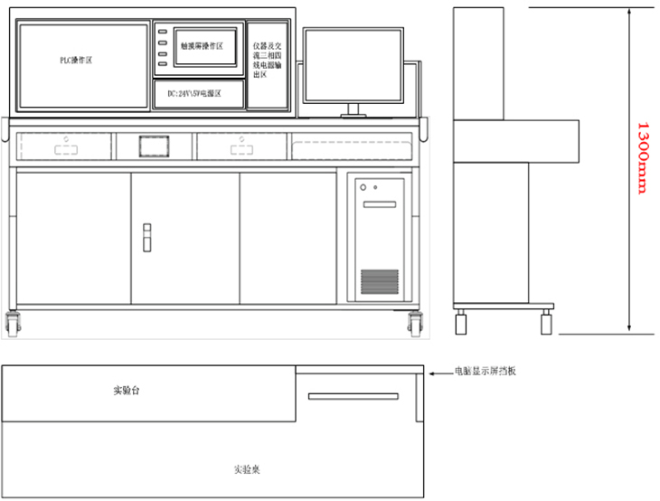 PLC技術(shù)應用實(shí)訓裝置采用鋁木結構實(shí)訓臺,實(shí)訓臺架由實(shí)訓臺、實(shí)訓桌、便攜式模塊、臺式電腦四大部分組成。實(shí)訓臺包括PLC操作區、觸摸屏操作區、直流電源輸出區、交流電源總電源控制保護和交流三相四線(xiàn)電源輸出區;實(shí)訓桌以經(jīng)氧化處理的高材質(zhì)鈑金作為設備主要框架材料,桌身分上下兩層,上層由三個(gè)活動(dòng)抽屜和一個(gè)鍵盤(pán)托板組成,下層左側為推拉式儲物柜,可存放工具材料、元器件等,右側部分空間可用于放置電腦主機。