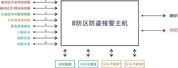 用戶(hù)與報警系統間的通訊界面。用戶(hù)可通過(guò)鍵盤(pán)發(fā)布指令;鍵盤(pán)則在用戶(hù)的整個(gè)操作過(guò)程中提供可視顯示和有聲提示。帶標有數字的防區指示燈,用于顯示各個(gè)防區的狀態(tài) |