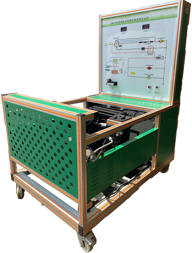 中型高機動(dòng)車(chē)輛空調系統實(shí)訓臺、空調實(shí)訓臺采用新品空調系統的空調控制單元、控制面板、壓縮機、壓力開(kāi)關(guān)、蒸發(fā)器、冷凝器、電磁風(fēng)扇、各種電機等元件實(shí)物制作,實(shí)現 整車(chē)空調系統部件組成、工作原理的培訓。實(shí)訓臺增加外部電源功能, 由電機驅動(dòng)空調壓縮機工作,操縱空調系統控制單元可實(shí)現空調電控部 分正常工作(如散熱風(fēng)扇、鼓風(fēng)機、各風(fēng)門(mén)電機等)。