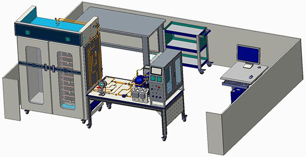 3、開(kāi)放性:該設備設置了一個(gè)系統操作臺,在庫體一側安裝有可更換側板,以便于學(xué)員在上述的操作臺與側板上安裝制冷系統和電路系統等。