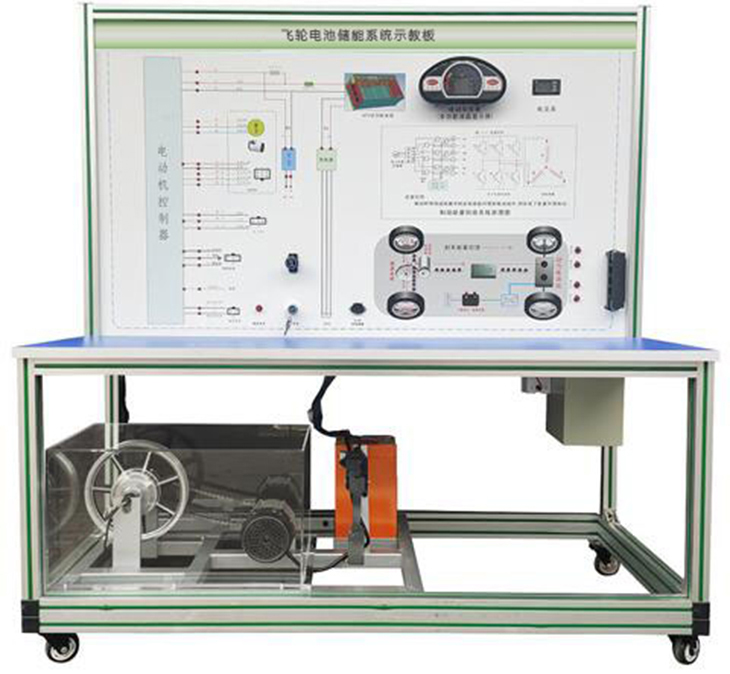 以電動(dòng)汽車(chē)飛輪儲能系統原理為基礎設計,系統包含動(dòng)力電源,動(dòng)力電機,能量回收電機,慣性飛輪儲能裝置、電機驅動(dòng)器,油門(mén)踏板,剎車(chē)開(kāi)關(guān)、帶電機驅動(dòng)系統結構及工作原理的面板,可進(jìn)行能量回收實(shí)驗,可以通過(guò)調節不同轉速實(shí)現飛輪儲能,調節能量回收開(kāi)關(guān)即控制電機進(jìn)行能量回收,通過(guò)采集能量回收電機的輸出電量實(shí)現采集不同工況下飛輪儲能多少,用來(lái)進(jìn)行飛輪儲能的驗證實(shí)驗;