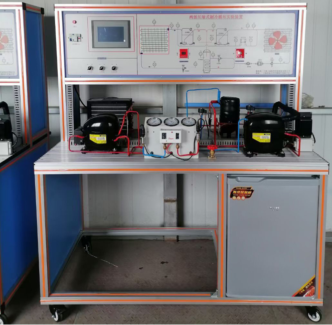 裝置應包含數據采集系統屏、實(shí)訓臺、交流電源控制、低溫保溫箱體,蒸發(fā)器、冷凝器、高級壓縮機、低級壓縮機、冷凝風(fēng)扇、中間冷卻系統等,管路中還設有控制閥等實(shí)訓所必需的部件組成的二級壓壓縮機循環(huán)制冷系統。