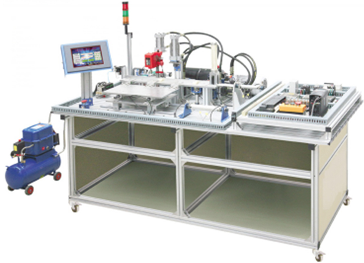 機電液氣一體化綜合實(shí)訓考核裝置的實(shí)訓工作臺為鋁合金型材組合而成,臺面上安裝有上料、傳送、沖壓加工、夾緊、鉆孔加工、分揀、入料槽等,并配有液壓系統、氣壓系統、變頻器及繼電器控制、PLC等