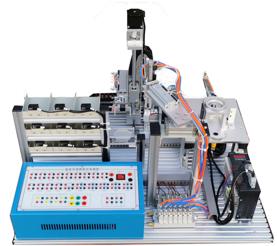 模型底板由10mm厚鋁板加工氧化而成,模型由堆垛機、立體倉庫、搬運機械手、稱(chēng)重加料機構、傳感器、氣缸等組成;所有機構由有1.2mm優(yōu)質(zhì)鋼板加工噴涂制作或鋁材機加氧化而成,堅固耐用。該任務(wù)堆垛機有步進(jìn)與伺服控制,負責物料的出入倉;機械手負責對物料的加料前后的搬運;稱(chēng)重加料機構對物料進(jìn)行稱(chēng)重及加料工作。同時(shí)為方便教學(xué),開(kāi)發(fā)了全開(kāi)放的任務(wù)接口盒,盒體由1.2mm優(yōu)質(zhì)鋼板加工噴涂制作,面板有鋁板噴涂蝕印沖孔而成,通過(guò)并口電纜與智能存儲任務(wù)模型連接,以迭插端子形式開(kāi)放模型接口,方便實(shí)訓教學(xué)。