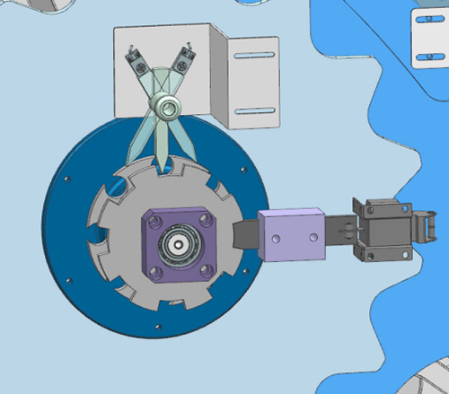 防逆轉裝置如下圖,裝置裝在扶梯上部驅動(dòng)位。在扶梯上行時(shí)凸輪順時(shí)針轉動(dòng),若扶梯發(fā)生異常情況而逆轉則凸輪逆轉,此時(shí)打桿使限位開(kāi)關(guān)動(dòng)作并使扶梯主剎動(dòng)作從而使扶梯停止,反之亦然。同時(shí)此功能具備手動(dòng)測試操作功能。