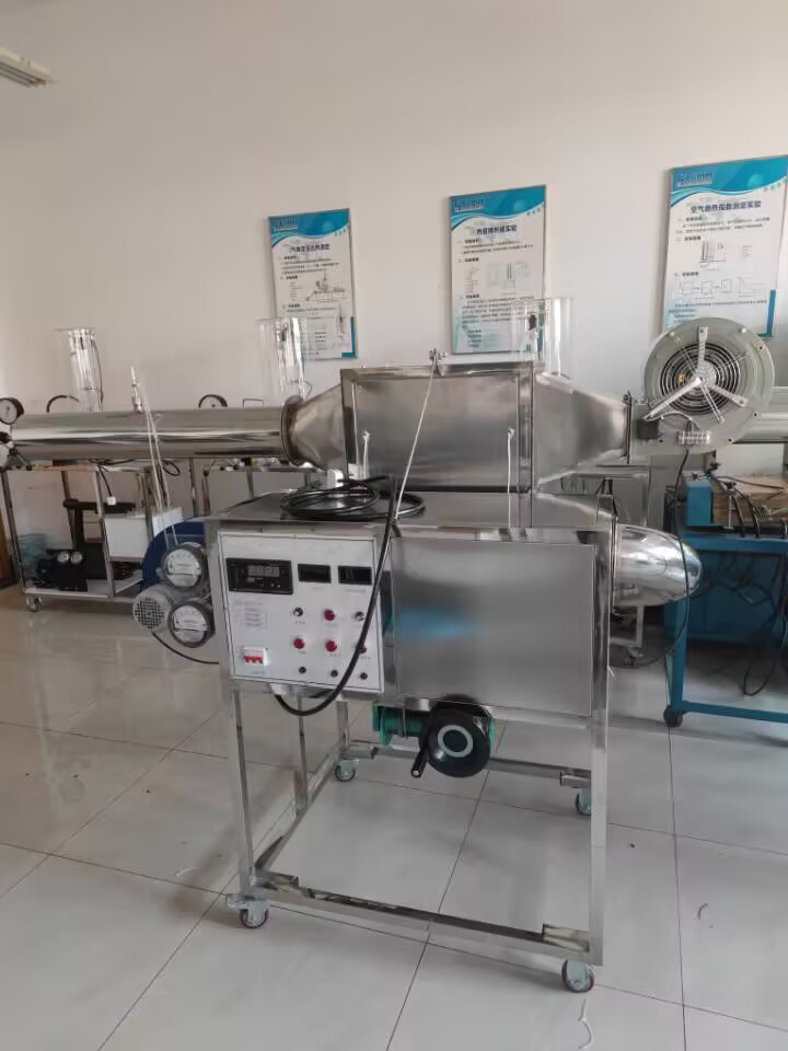 翅片管式熱管換熱器,加熱段循環(huán)加熱風(fēng)道,被加熱段加熱風(fēng)道,鼓風(fēng)機,風(fēng)機,笛形管流量計配差壓傳感器,加熱由固體調壓模塊無(wú)級調節,信號輸入巡檢儀顯示溫度、壓差,電流表,電壓表,不銹鋼臺架及控制屏等。