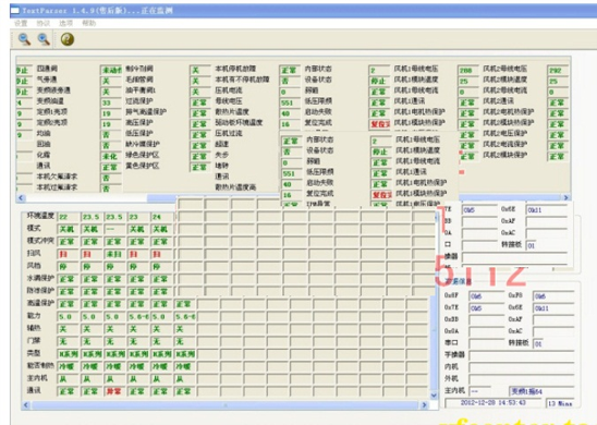 文本顯示界面:可測試壓縮機的運轉頻率,傳感器的各種數據,電子膨脹閥的工作步數等幾十種中央空調的工作數據和狀態(tài),