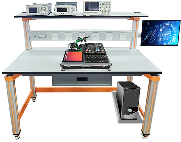 實(shí)訓桌規格為1200(長(cháng))*700(寬)*1150(高),設有一個(gè)鍵盤(pán)托一個(gè)抽屜,桌子下部靠后右邊有一個(gè)電腦主機箱托。實(shí)驗桌主體結構全部采用高性能表面氧化的鋁型材及一次成型鋁壓鑄框架連接構件,連接構件采用壓鑄成型工藝(非焊接工藝),經(jīng)機加工、拋丸、噴砂,表面靜電噴涂工藝,安裝方便、快捷,用戶(hù)可自行DIY組裝。桌體立柱采用工業(yè)鋁型材成型工藝,表面氧化處理,截面尺寸:70mm×70mm,四面帶槽,槽寬約8mm,端部裝有注塑成型配套塑料堵頭。桌面采用25mmE1級三聚氰胺飾面板,桌面板下設支撐框架,承受力不少于300kg。實(shí)訓裝置整體簡(jiǎn)約不簡(jiǎn)單,高端大氣,符合現代化產(chǎn)品審美和發(fā)展趨勢。
